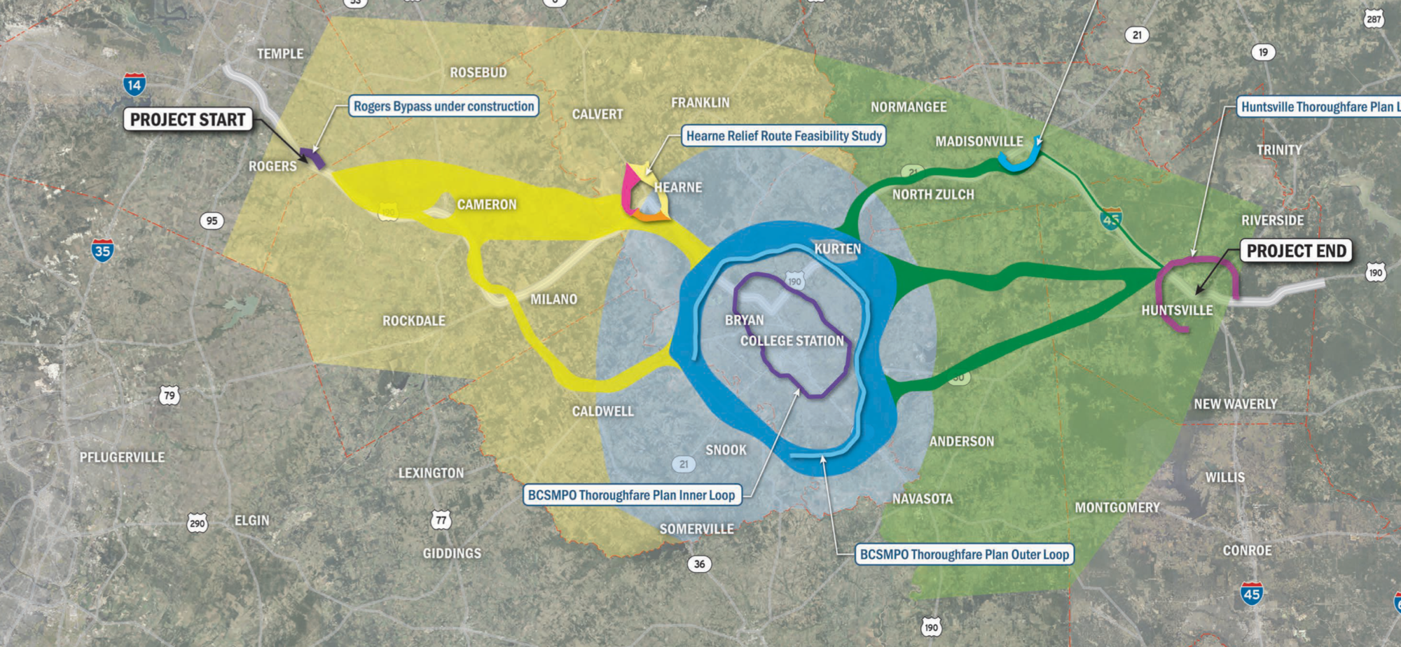 Federal legislation authorized a loop encircling the Bryan/College Station area as an interstate highway to be numbered I-214. A future loop (Huntsville Thoroughfare Planned Loop) is being planned around the Huntsville area.